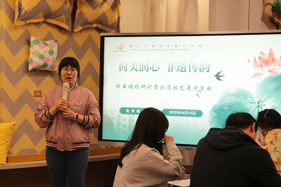 評課后,各校專業(yè)組長觀摩了浙江開放大學臨平學院藝術設計教研組開展的“荷美潤心,非遺傳韻”校本課程研討暨非遺技藝展示活動。