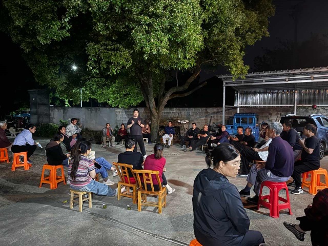 夜幕悄然籠罩大地,社區(qū)的空地上卻燈火通明、熱鬧非凡。一棵枝繁葉茂的大樹宛如忠誠的衛(wèi)士,守護著樹下圍坐成圈的居民們。大家臉上洋溢著期待,眼神中閃爍著求知的光芒,認真聆聽著培訓的內容。