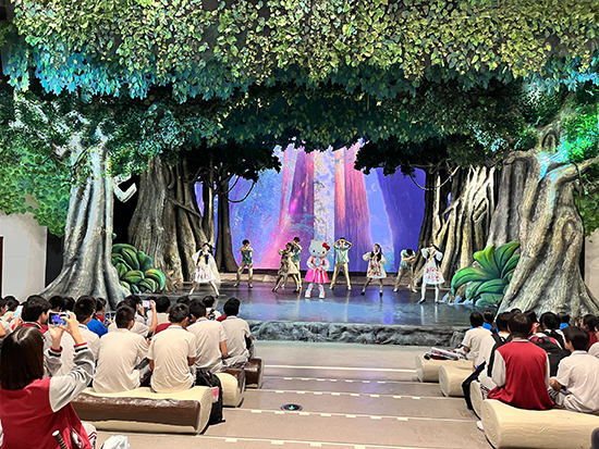 樂園舉辦了一場熱場表演,經典童話角色驚艷亮相,融合夢幻燈光、動感音效,營造沉浸式歡樂氛圍,開啟了學生一天的奇幻之旅。