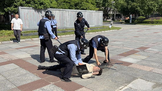 演練以“歹徒持械強行闖入校園”為模擬情境。一名“不法分子”企圖闖入校園,安保員立即啟動應急預案,迅速響應。報警系統(tǒng)觸發(fā)后,保安隊員手持防暴盾牌、鋼叉組成防御隊形,與“歹徒”周旋,3分鐘內(nèi)合力制服“歹徒”。整個流程緊張有序,保安員們配合默契。