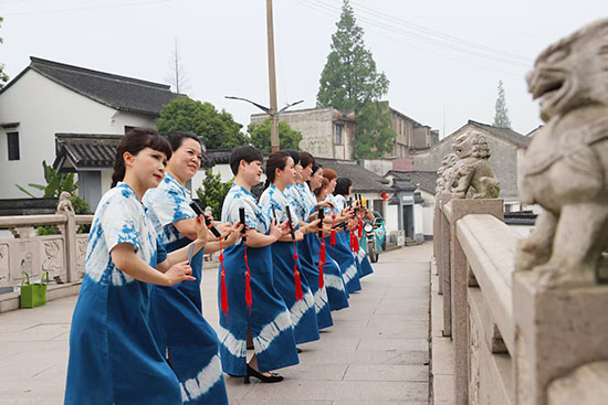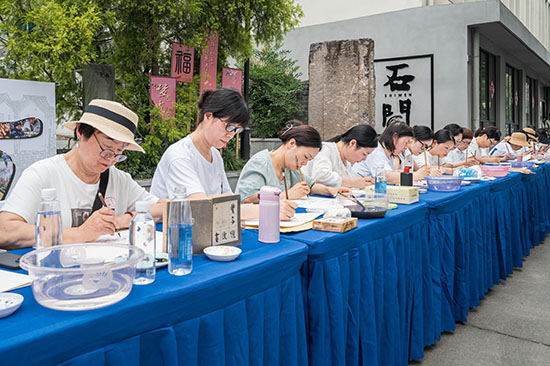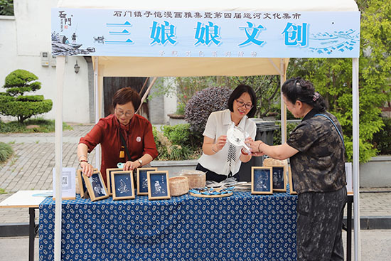 活動的精彩遠(yuǎn)不止于漫畫創(chuàng)作。身著藍(lán)印花布扎染旗袍的“三跳曲藝三娘娘”沿河巡唱,清脆的三跳板聲與悠揚(yáng)唱腔交織成文化韻律;攝影團(tuán)隊(duì)“三娘娘”以七大主題攝影作品拼出“石門是個好地方”的立體畫卷,用鏡頭語言訴說家鄉(xiāng)之美;手工“三娘娘”則將藍(lán)印花布刺繡、藤編器物與子愷漫畫扇進(jìn)行愛心義賣,讓藝術(shù)創(chuàng)作與公益行動溫暖共鳴。再加上石門灣特色美食飄香,活動現(xiàn)場成為集藝術(shù)、文化、公益于一體的沉浸式學(xué)習(xí)空間。