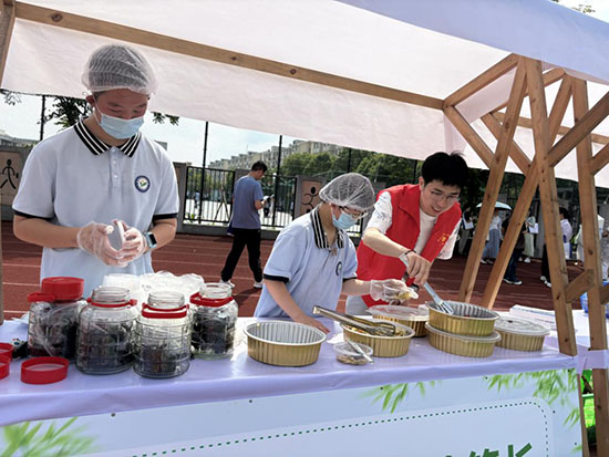安吉學(xué)院的兩位志愿者老師主要在食品攤位前負責(zé)場地的環(huán)境衛(wèi)生和“小攤主”的照看工作。兩位“小攤主”互幫互助,一位裝盒封蓋,一位打包系結(jié),配合默契。有時候,裝盒的那位“小攤主”說話少了,我們的志愿者老師就會引導(dǎo)他和來賓進行互動交流,盡管小伙子非常害羞,但還是非常主動地參與進來。這一場體驗,對我們的志愿服務(wù)工作有一個新的啟發(fā),安吉學(xué)院志愿服務(wù)工作隊不僅要繼續(xù)深入?yún)⑴c社會公益服務(wù)工作,更要積極參與社會特殊全體的照拂工作,以己之身,奉獻社會!(周斌斌)