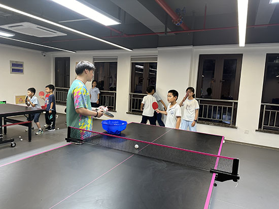 課堂上,教練將專業技巧轉化為生動有趣的教學內容。用 “小火箭發射” 比喻發球動作,以 “小衛士擋球” 引導接球姿勢,讓孩子們在游戲化教學中掌握乒乓球基本要領。為調動積極性,教練還設置了 “擊球闖關賽”“雙人協作挑戰” 等環節,孩子們分組競技,加油聲、歡呼聲此起彼伏。在寓教于樂中,孩子們不僅提升了球技,還培養了團隊協作意識。