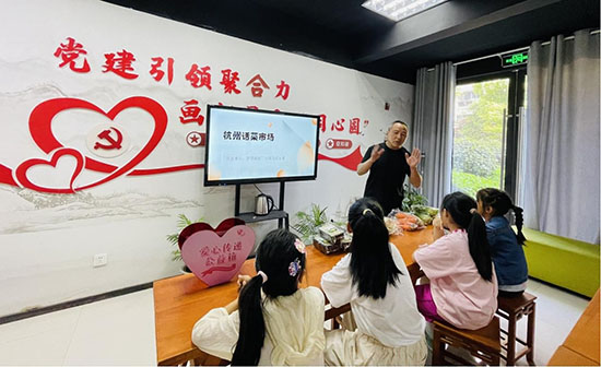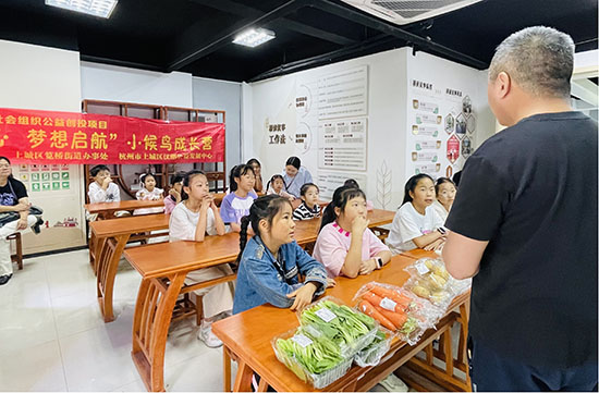 活動伊始,15名“小候鳥”在工作人員的引導下有序簽到。課堂環節,杭州話指導老師劉老師手持新鮮的蔬菜和水果,用生動的實物教學法向孩子們介紹常見食材的杭州話名稱。“土豆叫‘洋芋奶’,青菜叫‘毛毛菜’,買的時候要問‘多少鈔票一斤’……”孩子們圍坐一圈,一邊觀察食材,一邊跟著老師反復練習發音。為了讓學習更貼近實際,老師還設計了情景對話模擬,比如討價還價時要說“便宜點嘞”,孩子們現學現用,稚嫩的杭州話引得現場笑聲連連。