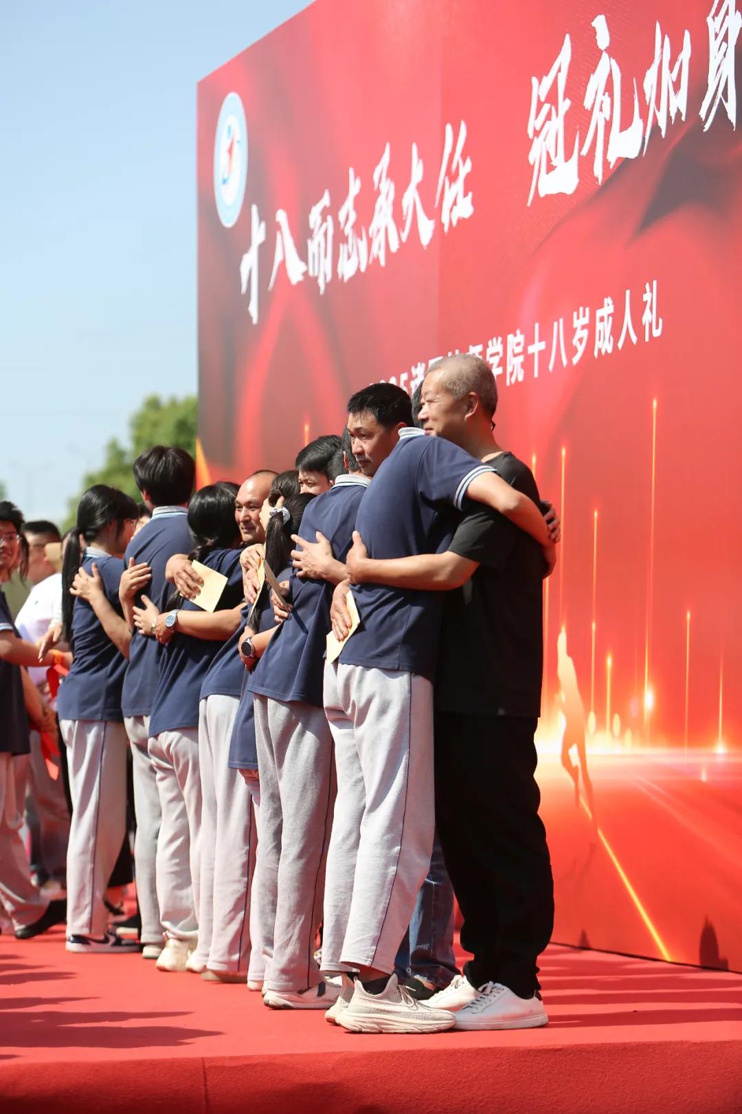 金萍女士代表家長發(fā)言。她祝福技師青年揚帆起航,滿載而歸。家長們親手為孩子佩戴上成人徽章、系上祝福絲巾小小的物件,裝滿了沉甸甸的愛與期望。學生捧出親手制作的感恩賀卡,用文字表達對父母的感激,同時向家長和老師道一聲“爸爸媽媽,我愛您!老師,我愛您!”并深情擁抱。在這一刻,所有人的情緒進行釋放,淚灑現(xiàn)場。