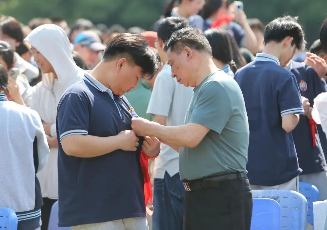 “育才1號”合唱團學生合唱《值得》獻禮高三學長學姐,獻歌的同時學校為每位高三學生送上一份沉甸甸的成人徽章,成人禮徽章以赤紅數(shù)字“18”勾勒外部輪廓,內(nèi)部鑲嵌白底燙金校徽,輔以深邃藍綬帶纏繞,邊緣飾以鎏金線條勾勒。“十八而志”四字筆鋒蒼勁有力,“銘恩礪行”彰顯使命擔當?;照略⒁庵鴮W校學子以志向為帆,以感恩為槳,砥礪前行,跨越成長之浪。