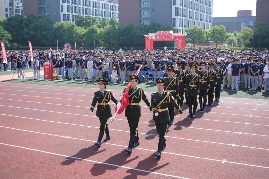 國旗護衛(wèi)隊入場,升國旗奏唱國歌。全體人員行注目禮,在激昂的國歌聲中,五星紅旗冉冉升起,迎風飄揚,激發(fā)了在場所有人的愛國之情。18響禮炮轟鳴,象征著學生們正式步入18歲成年,開啟人生新征程。