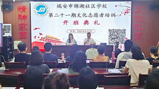 6月3日晚,瑞安市錦湖社區學校文化禮堂內熱鬧非凡,第二十一期文化志愿者培訓班開班典禮在此隆重舉行。來自瑞安各界的30余名文化愛好者齊聚一堂,共同開啟以“音樂為媒,文化潤心”為主題的志愿服務培訓之旅,為鄉村文化振興注入鮮活力量。