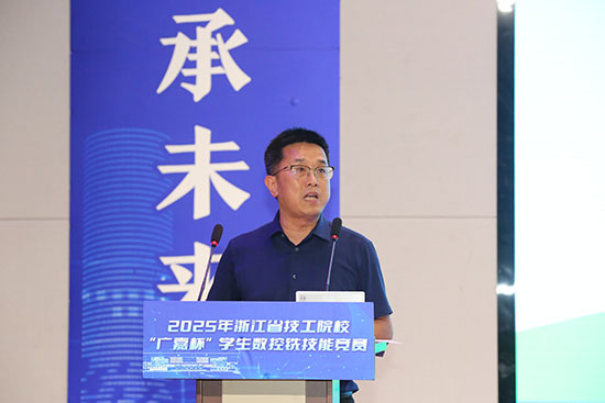 海寧技師學院黨委副書記、校長姚忠杰致辭,首先介紹了學院辦學情況,作為海寧唯一培養(yǎng)高技能人才的院校,學校現(xiàn)有雙校區(qū)共341畝,開設數(shù)控、設計、烹飪、旅游、學前等19個專業(yè),累計輸送3萬余名技能人才。他同時表示,將嚴格遵循大賽組委會指導,以高度責任感推進賽事保障,全力營造安全、規(guī)范、公平的競賽環(huán)境。