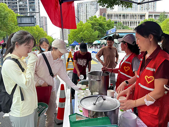 除了安排遮陽(yáng)避雨棚之外,今年信誠(chéng)社區(qū)還特別啟用了距考點(diǎn)150米的濱誠(chéng)云府鄰里食堂作為家長(zhǎng)休憩區(qū),配備空調(diào)設(shè)備、充電設(shè)施、急救藥箱,并提供心理咨詢與陪伴服務(wù)。社區(qū)“信福糕點(diǎn)坊”同步推出傳統(tǒng)定勝糕,搭配現(xiàn)熬綠豆湯與冰鎮(zhèn)酸梅湯等消暑飲品,為考生及家長(zhǎng)送上“旗開得勝”的美好祝愿。服務(wù)保障組構(gòu)建起“清涼補(bǔ)給-應(yīng)急處置-心理疏導(dǎo)”全鏈條服務(wù)體系,確保考生家長(zhǎng)獲得全要素支持。