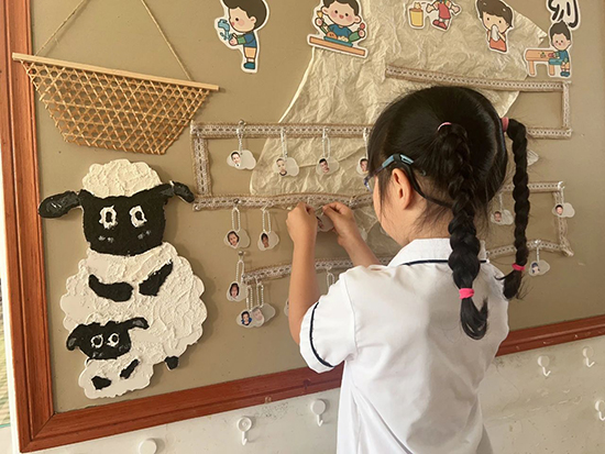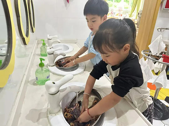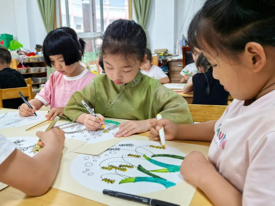 吟誦詩歌:一“收”一“種”,是一個充滿希望、萬物生長的美好節氣。“熟梅天氣豆生蛾,一見榴花感慨多。芒種積陰凝雨潤,菖蒲修剪莫蹉跎。”幼兒們合著節拍朗朗誦讀,跳起手勢舞,領略芒種節氣的物候特點和生活內涵。
