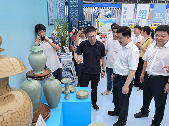 展會當天,省人力社保廳黨組書記、廳長吳偉斌,廳黨組副書記、副廳長張旭明等領(lǐng)導蒞臨現(xiàn)場,深入各市級展區(qū)考察。在上虞區(qū)技工學校展位前,省市領(lǐng)導饒有興致地駐足,詳細聽取了學校參展作品的介紹。吳偉斌廳長對學校將人工智能融入技能教學的實踐模式表示高度贊賞,更對傳統(tǒng)與現(xiàn)代創(chuàng)意兼具的越窯青瓷作品贊嘆不已,充分肯定了學校專業(yè)建設(shè)方面取得的成效。他鼓勵學校繼續(xù)發(fā)揮優(yōu)勢,深化產(chǎn)教融合,為社會培養(yǎng)更多高素質(zhì)技能人才。