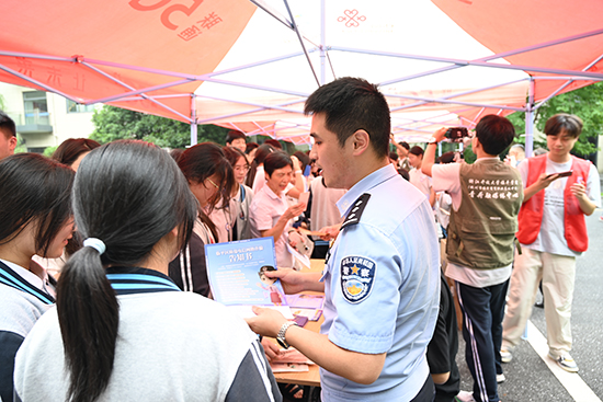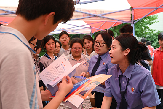 講座結束后,活動進入互動實踐環節。區檢察院、區教育局、區公安分局等政法系統職能部門設立多個普法宣傳點位,為同學們提供全方位的法治教育。區檢察院工作人員耐心解答同學們在未成年人保護方面的法律困惑;區教育局老師圍繞校園安全與教育法規,引導學生樹立正確的學習生活觀念;區公安分局民警通過展示反詐、禁毒宣傳展板、發放宣傳手冊等方式,進一步強化同學們的法治認知。現場同學們熱情高漲,紛紛圍在各點位前,認真觀看、仔細閱讀、踴躍提問,工作人員也一一給予細致解答,互動氛圍熱烈非凡。