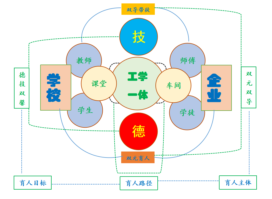 圖一  “工學一體,雙元雙導,德技雙馨”人才培養模式架構圖