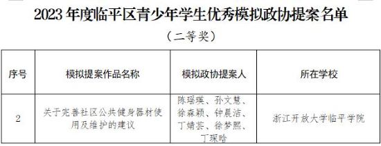 2023年浙江開放大學臨平學院學生校外成長導師、區(qū)政協(xié)委員金丹文和思政教師朱曉燕組成“雙導師”,共同指導學生參加模擬政協(xié)提案活動。通過實地走訪、問卷調查、與相關職能部門座談交流,同學們發(fā)了社區(qū)公共健身器材在監(jiān)管、維護上存在的問題,并提出若干切實可行的完善建議。最終提案《關于完善社區(qū)公共健身器材使用及維護的建議》獲得全區(qū)青少年學生優(yōu)秀模擬政協(xié)提案二等獎。