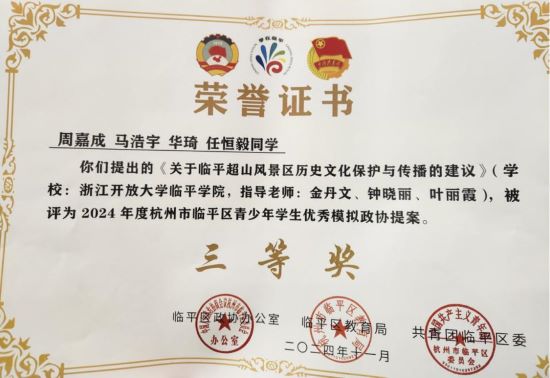 2024年校學生校外成長導師、區(qū)政協(xié)委員金丹文和思政教師鐘曉麗、葉麗霞,繼續(xù)指導學生參加模擬政協(xié)提案活動,通過深入調研,提出提案《關于臨平超山風景區(qū)歷史文化保護與傳播的建議》,對當前超山風景區(qū)歷史文化保護與傳播方面存在的問題提出了一些具體可操作的建議,提案最終獲得區(qū)級三等獎。