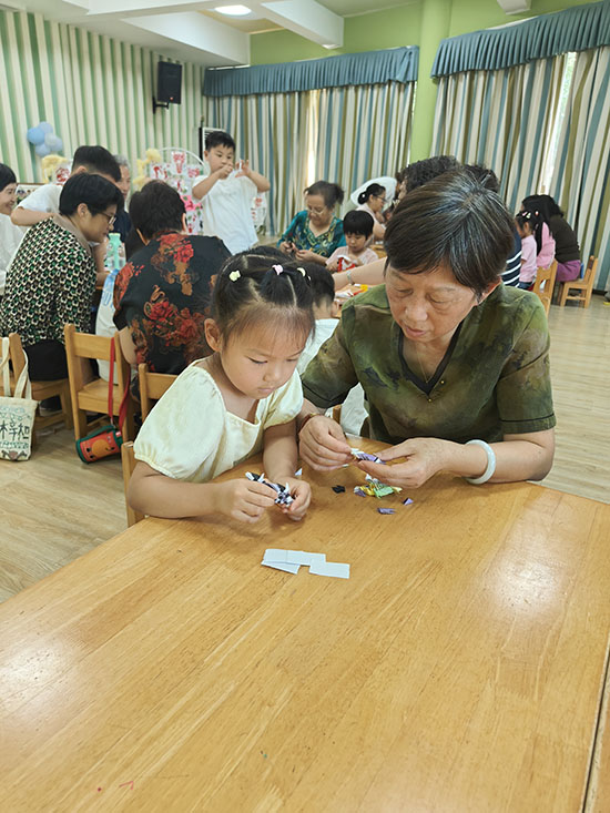 活動(dòng)中祖輩們歡聲一片,參與盤衍紙創(chuàng)作的李奶奶,望著自己和小孫女共同完成的旗袍掛飾,眼角笑出皺紋:“活了大半輩子,頭回碰盤衍紙,剛開始笨手笨腳,多虧孩子有耐心教。咱老年人能和孫輩有這么個(gè)共學(xué)的事兒,心里暖烘烘的,這傳統(tǒng)文化啊,就得這么一輩一輩接著傳!”話語(yǔ)間,滿是對(duì)代際傳承的欣慰,和參與活動(dòng)的滿足。 三角插紙展區(qū)里,王奶奶小心翼翼地整理著與小外孫女共同完成的小金魚作品,眼中滿是笑意:“這些都是我和外孫女一片一片拼出來(lái)的。剛開始總插錯(cuò),反而是孩子手把手教我。看著這些五顏六色的紙片在我們手里變成活靈活現(xiàn)的小魚,就像看到傳統(tǒng)文化在我們一老一小之間生根發(fā)芽,特別有成就感!”
