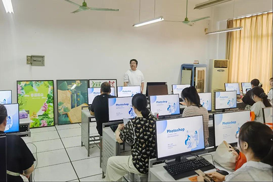 本次培訓充分利用學校師資優勢,邀請工藝美術專業部三位骨干教師分別講授Photoshop圖形軟件運用、海報與背景設計、新聞攝影與后期等課程,同時,特邀湖州職業技術學院李娜副教授開設AI生成式模型應用專題課程。培訓注重實踐,學員們在教師指導下動手設計海報、處理圖片、訓練AI生成圖片、制作視頻等,并在學校美育展廳模擬參觀拍攝,深化對校園新聞攝影的理解。