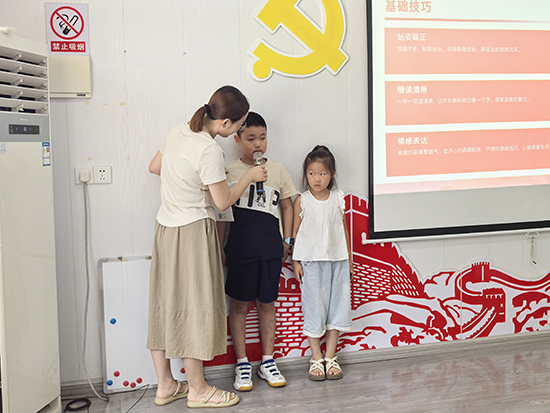 在朗誦技巧小課堂上,老師從站姿儀態、吐字清晰度到情感表達等方面進行了基礎指導。通過“四聲歌”、口部操、氣息訓練等趣味互動練習,孩子們在輕松愉快的氛圍中逐步掌握了朗誦要領。