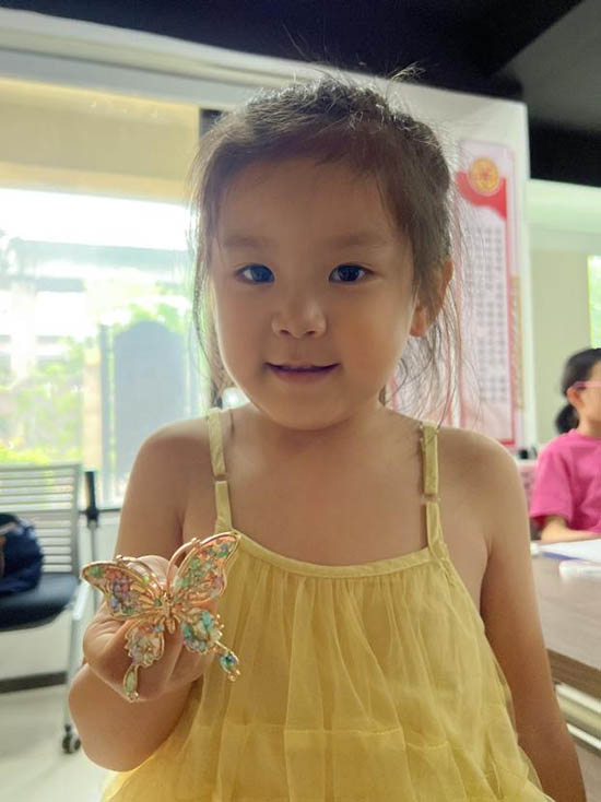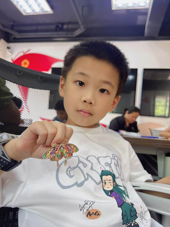 短短一小時很快過去,孩子們都順利完成了作品。陽光下,蝴蝶胸針的翅膀折射出細碎的光,牡丹胸針的花瓣層層疊疊,每一件都精致又可愛。孩子們舉著自己的成果,臉上滿是自豪的笑容,還互相“炫耀”著彼此的作品。