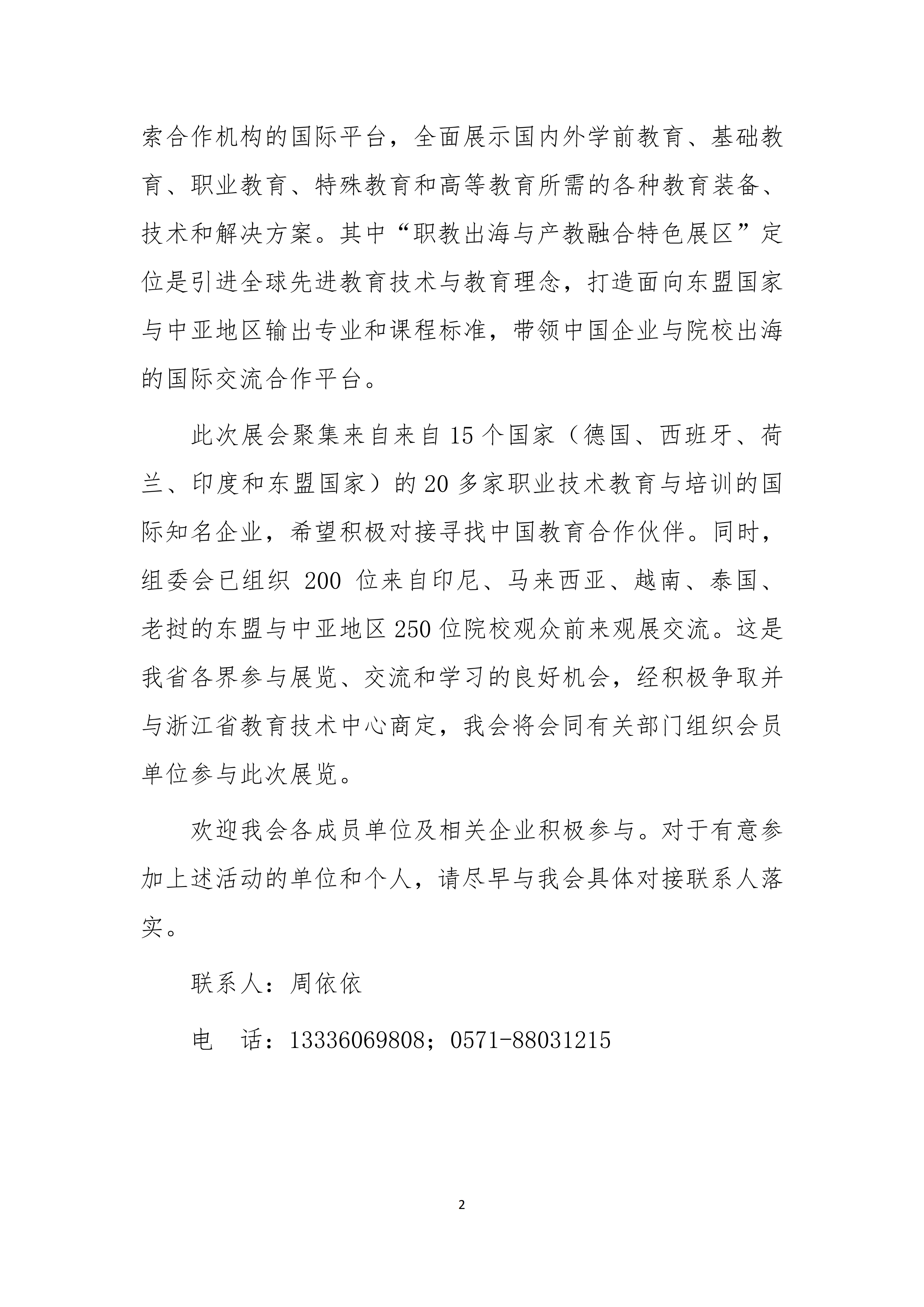 此次展會聚集來自來自 15 個國家(德國、西班牙、荷蘭、印度和東盟國家)的 20 多家職業技術教育與培訓的國際知名企業,希望積極對接尋找中國教育合作伙伴。同時,組委會已組織 200 位來自印尼、馬來西亞、越南、泰國、老撾的東盟與中亞地區 250 位院校觀眾前來觀展交流。這是我省各界參與展覽、交流和學習的良好機會,經積極爭取并與浙江省教育技術中心商定,我會將會同有關部門組織會員單位參與此次展覽。