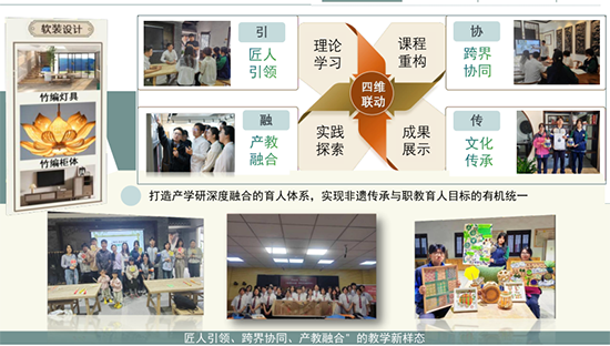 建筑裝飾攜手藝術設計專業組,以“跨界學習”為核心理念,聚焦于《建筑裝飾設計綜合實訓》課程中的“非遺新生”項目開展教學創新與實踐,通過“理論學習—課程重構—實踐探索—成果展示”的四維聯動,形成 “匠人引領、跨界協同、產教融合” 的教學新樣態。