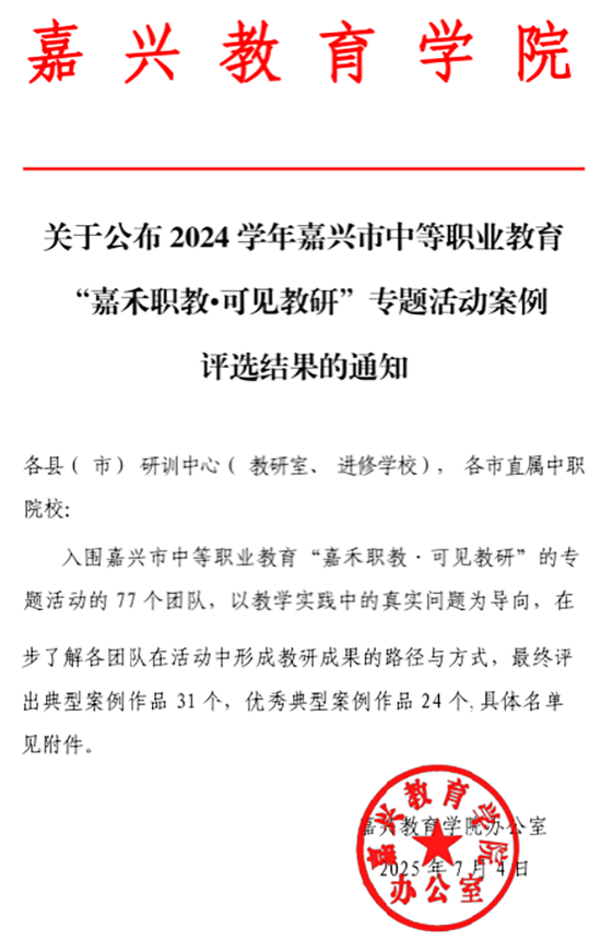 從制定主題教研方案到最終的展示與答辯,學校厚生建筑專業組、工程造價專業組、建筑智能專業組、建筑裝飾攜手藝術設計專業組的四個作品在全市77個團隊中脫穎而出,全部獲得“嘉禾職教·可見教研”專題活動評選的優秀典型案例。