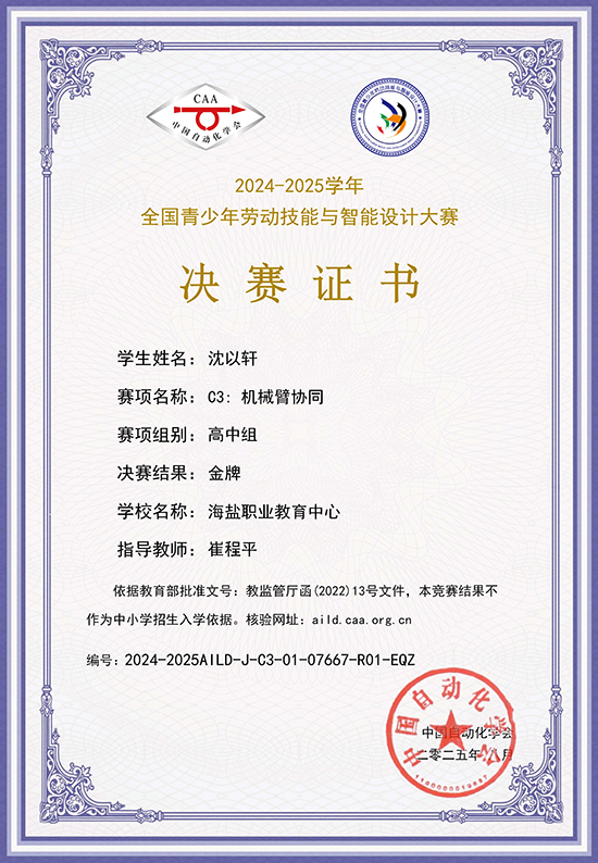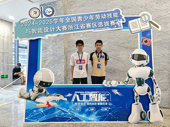 近日,2024—2025學年全國青少年勞動技能與智能設計大賽總決賽在桐鄉烏鎮落下帷幕。海鹽職業教育中心智能制造與交通學部沈以軒、朱張毅兩位同學,憑借扎實的專業功底和出色的賽場發揮,在AILD 智能設計大賽編程智控—機械臂協同(高中組)競賽中脫穎而出,榮獲全國總決賽金牌。