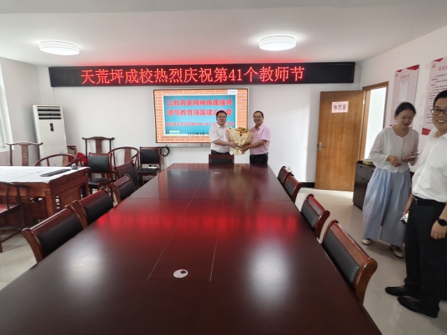 活動現(xiàn)場布置得簡潔而莊重,“天荒坪成校熱烈慶祝第 41 個教師節(jié)” 的電子屏十分醒目,傳遞著對教師的敬意與祝福。鎮(zhèn)領(lǐng)導(dǎo)的到來,讓現(xiàn)場的氛圍更加熱烈。