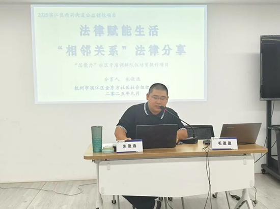 9月15日,杭州市濱江區(qū)西興街道金東方社區(qū)老年學(xué)堂成功舉辦了一場(chǎng)以“鄰里關(guān)系”為主題的普法講座,特邀專業(yè)律師朱俊逸擔(dān)任主講人。