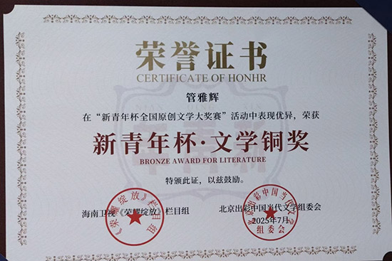 文章完成后,班主任李安興老師鼓勵我大膽嘗試投稿。在他的幫助下,我懷著忐忑又期待的心情,將文章投給了海南衛視《榮耀綻放》欄目組,以及由北京出彩中國當代文學組委會主辦的“新青年杯全國原創文學大獎賽”。從初審、大眾投票到終審,每一步我都格外關注,而最終的結果,遠遠超出了我的預期——經過專家評審團的最終評定,我的文章有幸獲得了本次大賽的“文學銅獎”。得知獲獎的那一刻,內心的激動與喜悅幾乎無法用語言形容:這不僅是對我個人努力的肯定,更是對我所熱愛的計算機專業、對日新月異的AI技術的認可。