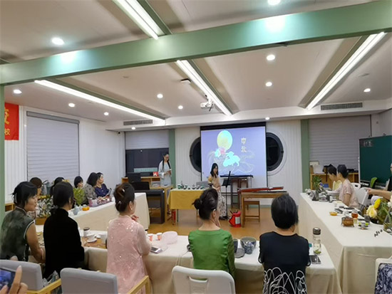 活動現(xiàn)場,書畫室的雅致氛圍與茶香、樂聲相融。學(xué)員們卸下平日的忙碌,各展所長:有人端坐案前,指尖輕撥古琴弦,《平沙落雁》的悠揚旋律緩緩流淌,瞬間讓現(xiàn)場靜了下來;有人手持茶器,行云流水般演繹著茶藝沖泡,溫杯、投茶、注水、出湯,每一個動作都透著專注與從容,茶湯的清香隨之彌漫開來;還有人拿起玉簫,簫聲清越婉轉(zhuǎn),與古琴、茶香交織,勾勒出別樣的中秋意境。