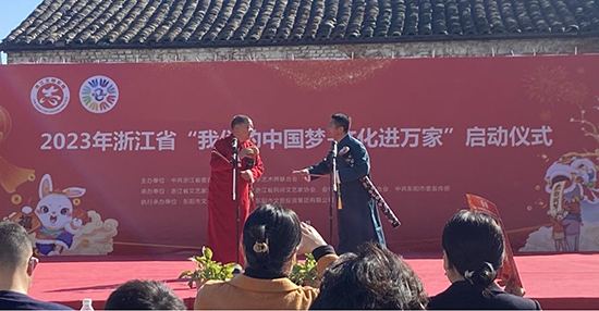 “古老里格東陽(yáng)好神奇,好山那個(gè)好水金寶地……”在一聲聲有節(jié)奏的“澎吉吉澎,澎吉吉澎”道情筒的拍打聲中,熟悉的東陽(yáng)道情在非遺書場(chǎng)飄蕩,吸引一大眾趕來(lái)聆聽的觀眾,這是東陽(yáng)道情的金華市級(jí)非遺傳承人呂強(qiáng)在表演。呂強(qiáng),浙江東陽(yáng)橫店鎮(zhèn)人,1982年出生,2004年師從浙江省級(jí)非遺傳承人吳洵梅,開始東陽(yáng)道情的從藝之路,并孜孜以求,將弘揚(yáng)東陽(yáng)道情文化當(dāng)作一生的事業(yè)追求,為東陽(yáng)道情的新時(shí)代發(fā)展做出了積極的貢獻(xiàn)。現(xiàn)為東陽(yáng)電視臺(tái)新時(shí)代文明講堂主講人,東陽(yáng)市曲藝協(xié)會(huì)主席,東陽(yáng)市非物質(zhì)文化遺產(chǎn)保護(hù)協(xié)會(huì)副秘書長(zhǎng),東陽(yáng)市文聯(lián)常務(wù)理事,金華市曲藝家協(xié)會(huì)副秘書長(zhǎng),金華市級(jí)非物質(zhì)文化遺產(chǎn)(東陽(yáng)道情)代表性傳承人,浙江省曲藝家協(xié)會(huì)理事,東陽(yáng)市及金華市“百姓學(xué)習(xí)之星”。