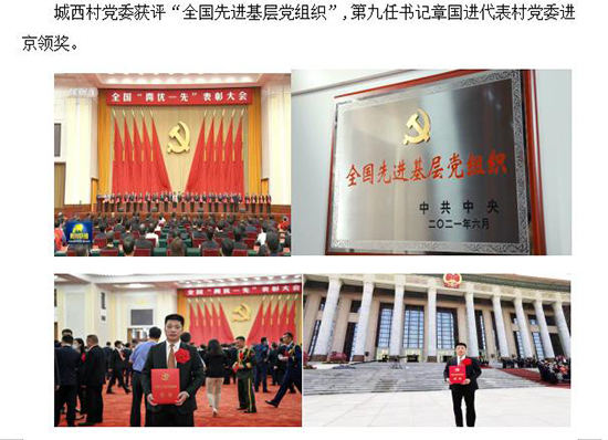 1957年,城西村黨支部建立,自章正合擔任首任書記以來62年,九任書記不忘初心,牢記使命,一任接著一任干,帶領村民,發展生產,擺脫貪困,走向富裕,同奔小康。老黃牛書記章正合;改革先鋒書記金積貴;智多星書記章以齊;加減書記葉加法;自拆書記章宏將;三讓書記章宏軍;三改書記章平;拼命書記章以家;初心接力書記章國進。