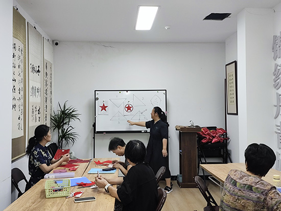 實操環(huán)節(jié)中,沈敏反復(fù)強調(diào)使用剪紙工具時的安全性。然后針對中老年學(xué)員動手特點,初始練習(xí)由簡入難,從“剪線條、折對稱花紋”等基礎(chǔ)動作教起,一對一糾正握剪姿勢與裁剪力度。學(xué)員們熱情高漲,相互交流技巧,部分學(xué)員還主動分享自己的創(chuàng)作思路,現(xiàn)場完成多幅基礎(chǔ)剪紙作品。