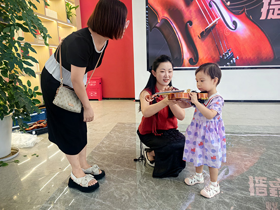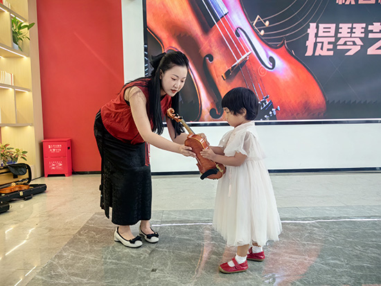 新碶街道社教中心梧桐分中心將持續推動服務模式從“被動響應”向“主動發掘”延伸,不僅關注居民的“急難愁盼”,更積極發掘社區中的“隱形”人才,鼓勵“居民服務居民”的鄰里互動。社區網格員在日常走訪中,留意到居住在社區內、具備精湛小提琴演奏技藝與深厚音樂素養的胡曉光老師。在社區的誠摯邀請下,胡老師欣然接受邀請,主動提供12臺小提琴作為公共教學設備,并親自為鄰居們授課。更令人欣喜的是,在古琴演奏方面也頗有造詣的胡老師女兒胡蘊子,也深受感染,表示下一步愿向社區居民傳授古琴技藝,助力傳統民樂傳承。胡老師一家正以實際行動,讓高雅藝術走入尋常百姓家。
