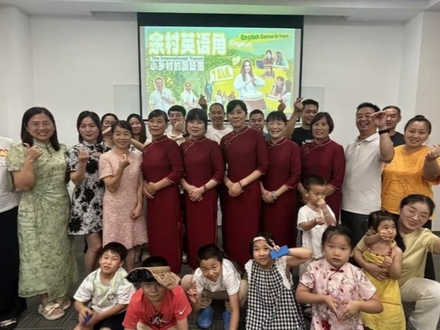 活動當日,余村的活動室內(nèi)氣氛熱烈,投影屏幕上 “余村英語角” “小鄉(xiāng)村的國際范” 等字樣引人注目。參與活動的村民涵蓋老中青幼各個年齡段,大家齊聚一堂,興致勃勃地投入到英語交流與學習之中。身著喜慶服飾的村民與天真爛漫的孩子們,共同構(gòu)成了一幅充滿活力與希望的鄉(xiāng)村學習圖景。