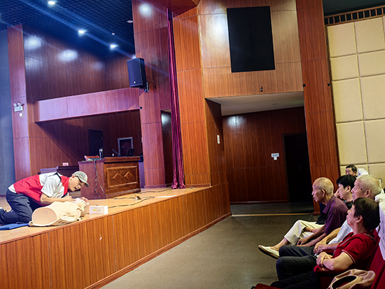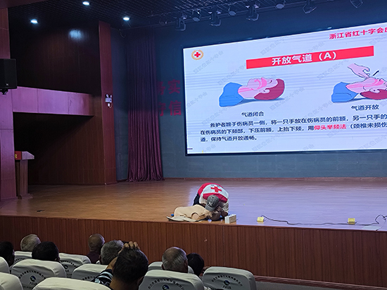培訓現場,來自浙江省紅十字會一級應急救護師丁柏偉講師結合日常生活中可能遇到的突發狀況,深入淺出地講解了掌握應急救護知識的重要性。丁講師重點圍繞心肺復蘇術(CPR)進行了系統教學,內容涵蓋如何快速判斷患者意識和呼吸狀態、如何正確進行呼救、胸外按壓的關鍵步驟(包括按壓部位、深度、頻率和力度的精準把握)、開放氣道的方法以及實施人工呼吸的有效技巧。講解過程中,講師通過生動的案例剖析,強調了“黃金四分鐘”對于挽救心臟驟停患者生命的決定性意義。