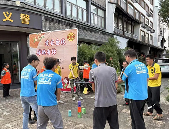 趣味游戲藏歡笑:玩著學(xué)安全,默契滿現(xiàn)場。安全課一結(jié)束,趣味游戲區(qū)變成了歡樂的海洋。紅楓義警早已備好旱地冰壺、“一錘定音”、同心搭高塔、安全飛行棋四大項目。“來,咱們組隊!”義警周偉國拉著幾位外賣小哥直奔旱地冰壺區(qū)。4人一組的比賽里,有人用力過猛讓冰壺“跑偏”,引得全場哄笑;有人穩(wěn)扎穩(wěn)打?qū)⒈鶋鼗浇K點,隊友們的歡呼聲響徹現(xiàn)場。“一錘定音”區(qū)更熱鬧,環(huán)衛(wèi)工人阿姨兩人一組,揮著小錘瞄準(zhǔn)木墩,“砰砰”聲中,木墩一個個被擊落,阿姨們樂得像孩子般拍手,義警們趕緊遞上紙巾:“阿姨您真厲害!”最讓人揪心又開心的是“同心搭高塔”。10人一組的隊伍里,外賣員、環(huán)衛(wèi)工人、紅楓義警并肩作戰(zhàn),有人遞積木、有人扶塔身,“慢點,左邊歪了”“再加一層,穩(wěn)住!”的提醒聲此起彼伏。當(dāng)高高的“積木塔”穩(wěn)穩(wěn)立在桌上時,所有人都露出了成就感滿滿的笑容,這一刻,陌生的彼此早已默契十足。安全飛行棋旁,4人輪流擲骰子——走到“不闖紅燈”前進(jìn)三步,踩到“逆行危險”后退兩步。“原來下棋也能學(xué)安全知識!”一位外賣小哥笑著說。義警隊長陳曉芳在旁補(bǔ)充:“可不是嘛!平時在路上,每一步都得像走棋一樣心里有數(shù)。”
