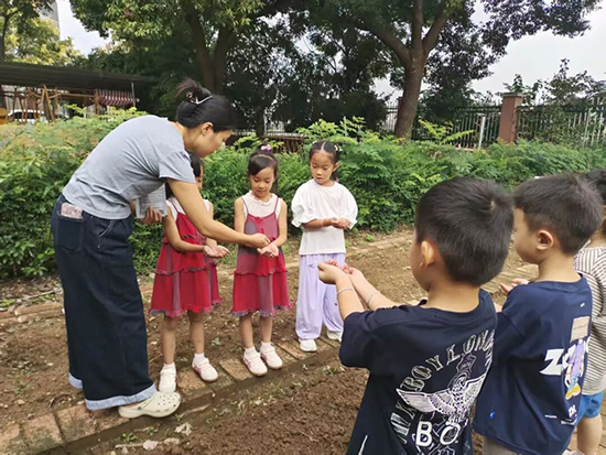 “秋風陣陣涼,節氣到霜降……”輕快的童謠響起,孩子們伸出小手跳起霜降手勢舞:手腕輕轉模仿落葉飄飛,掌心相對比作寒霜凝結,簡單的動作里藏著對節氣特征的生動詮釋。孩子們在唱唱跳跳中輕松記住霜降的物候特點,也讓略顯抽象的節氣文化,變得靈動又可感。
