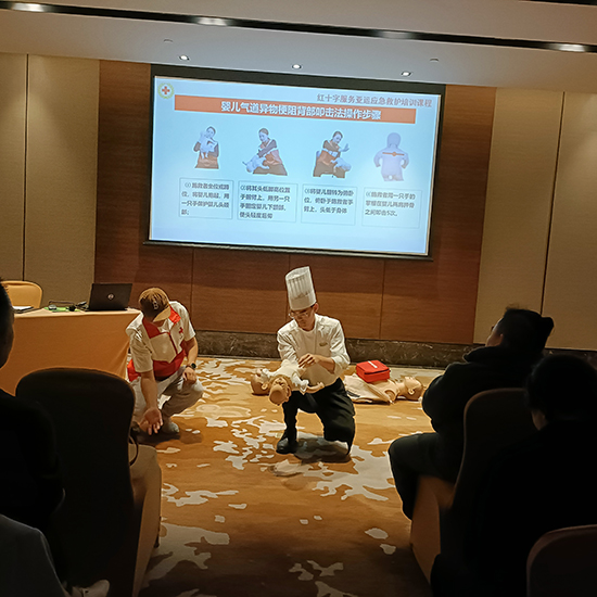 本次培訓(xùn)特邀浙江省紅十字會一級應(yīng)急救護(hù)師丁柏偉進(jìn)行授課。針對酒店行業(yè)的工作特性,丁老師重點(diǎn)講解了氣道異物梗阻的發(fā)生機(jī)理、易發(fā)人群識別及現(xiàn)場救護(hù)方法,并系統(tǒng)教授了心肺復(fù)蘇(CPR)的技能要點(diǎn)。