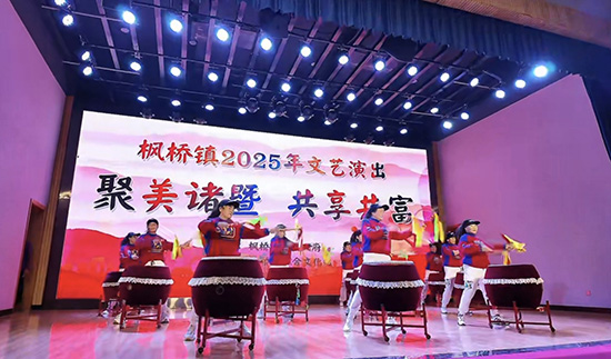 隨著激昂的鼓點奏響,楓一快樂鼓舞隊的鼓手們身著紅色表演服登臺,以一曲《精忠報國》點燃全場。他們氣宇軒昂、豪情滿懷,激越的鼓點裹挾著喜慶氛圍彌漫全場。接著,《好運連連》接續上演,氣勢恢宏的表演將現場氣氛推向第一個高潮,掌聲此起彼伏。