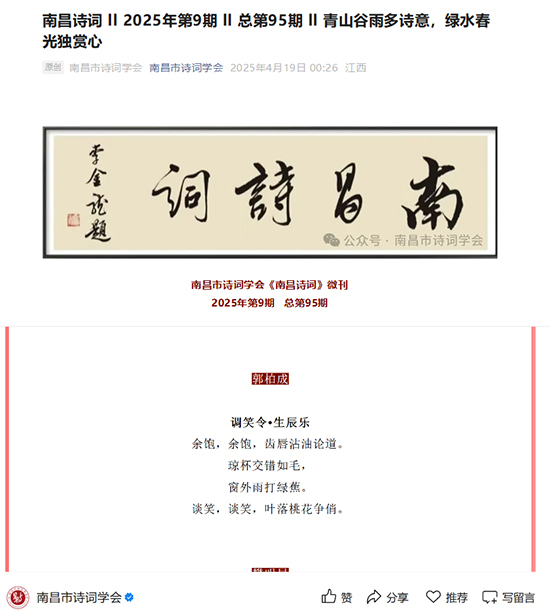 2025年,作品持續(xù)亮相于《南昌詩詞》、《洪都詩詞》等刊物,并憑借《長相思·百名詩人采風洞頭峽特大橋》再次登上《百島》;
