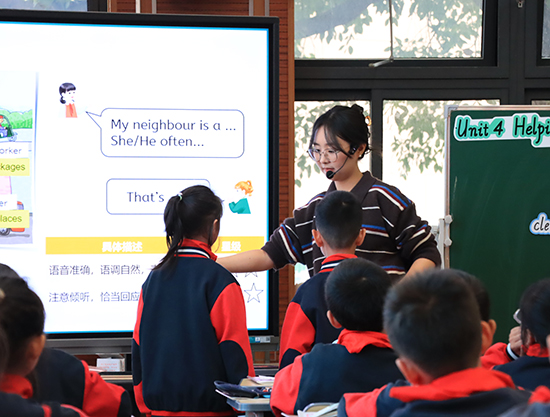 培訓(xùn)班學(xué)員張杭琴等六位教師,選取新教材的不同章節(jié),分別在李家巷小學(xué)、和平小學(xué)和林小學(xué)進(jìn)行課堂實(shí)踐。張杭琴圍繞社區(qū)場(chǎng)所展開教學(xué),設(shè)計(jì)層次分明,深度契合單元整體教學(xué)理念,成效扎實(shí)高效。徐虹敏緊扣單元目標(biāo),以情境和問題鏈層層推進(jìn),有效提升學(xué)生語言能力與社區(qū)服務(wù)素養(yǎng)。沈戀以食為趣,巧設(shè)問題鏈,引導(dǎo)學(xué)生借助思維導(dǎo)圖層層深入文本,并以開放性問題激發(fā)想象,展現(xiàn)邏輯與趣味并存的設(shè)計(jì)。鄭庭祎以歌謠與情境創(chuàng)設(shè)課堂,引導(dǎo)學(xué)生通過聽說演感知職業(yè)貢獻(xiàn),并以評(píng)選“社區(qū)之星”實(shí)現(xiàn)遷移創(chuàng)新。王丹伶則以舊引新,依托海報(bào)通過讀聽讀寫扎實(shí)教學(xué),終以制作海報(bào)達(dá)成知識(shí)遷移運(yùn)用。張蕾運(yùn)用歌謠熱身、問答激活、聽選匹配與制作天氣卡片等遞進(jìn)活動(dòng),讓學(xué)生在聽說辨中掌握核心詞匯,實(shí)現(xiàn)語言輸出與應(yīng)用。