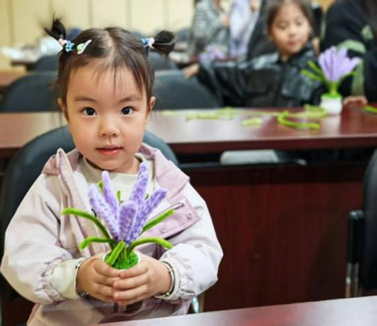 在扭扭棒創(chuàng)意手工課程,指導(dǎo)老師向大家展示了用扭扭棒制成的“多肉”“仙人掌”“玫瑰”等各式盆栽樣品。一件件精美別致的手工作品瞬間點(diǎn)燃了現(xiàn)場(chǎng)大小朋友們的創(chuàng)作熱情。在老師耐心講解了扭扭棒的彎折、纏繞、組合等基本技巧后,大家便迫不及待地動(dòng)手實(shí)踐。一雙雙小手認(rèn)真地將扭扭棒扭成枝葉,大人們則從旁協(xié)助,共同制作創(chuàng)意盆栽。現(xiàn)場(chǎng)不乏爺爺奶奶帶著孫輩共同參與的溫馨畫(huà)面,祖孫三代的歡聲笑語(yǔ)為活動(dòng)增添了別樣溫情。