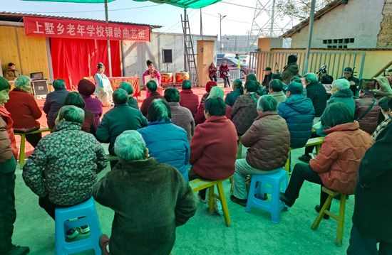 上墅學習中心的越劇老年長班經過多年積淀,每個學員從最初的不會如今都變成了能登臺獻藝的業余演員,為匯報成績鞏固學藝成果,我們想到了送戲進村一舉雙得的活動形式。首站劉家塘村越劇專場活動緊扣當地群眾喜好,精選了《何文秀——心連心》《王老虎搶親——寄閨》《碧玉簪——送鳳冠》《孔雀東南飛——洞房》等多個經典越劇片段,讓村民們耳目一新地感受越劇的獨特魅力。簡陋的舞臺悠揚的弦樂響起,演員們身著精致戲服,扮相俊美,步態輕盈,靈動的身段、婉轉的唱腔,不時贏得臺下陣陣掌聲。