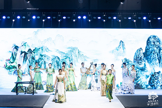 節(jié)目以“水墨”與“青綠”兩大中國傳統(tǒng)色系為基調(diào),將古典服飾、音樂與儀態(tài)巧妙融合,講述了一個極具東方神韻的故事。 演出始于“猶抱琵琶半遮面”的古典懸念。隨后,手持宮燈、身著青綠旗袍的演員款步而出,溫婉點亮江南夜色;一旁,撫琴奏樂、穿著水墨禮服的演員琴聲淙淙,勾勒出山水意境。在悠揚古韻中,演員們翩然登場。其妝容頭飾尤為精巧,設計師將毛筆、扇柄等元素化為頭飾,與主題緊密呼應,盡顯文化巧思 。