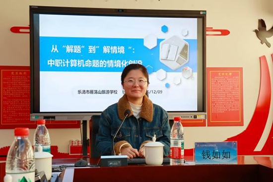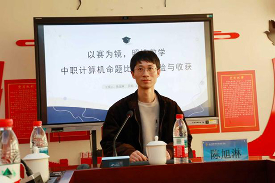 活動最后,三位教師帶來命題專題分享。錢如如老師以《從“解題”到“解情境”:中職計算機命題的情境化設計》為題,詳細介紹了自己的命題思路與實踐過程,分享了如何將知識點融入真實生活情境的命題亮點;周倩倩老師在《破題有“AI”:智能命題的效率與質量雙提升》中,毫無保留地分享了運用AI工具快速生成試題、優化命題質量的實用技巧,為提升命題效率提供了新路徑;陳旭淋老師則以《以賽為鏡,照進教學——中職計算機命題比賽的經驗與收獲》為題,講述了自己參與命題比賽的經歷,分享了以賽促研、以賽促教的成長感悟,為與會教師提供了寶貴參考。?