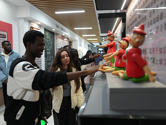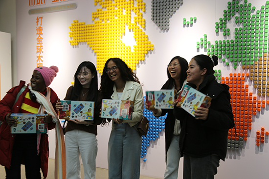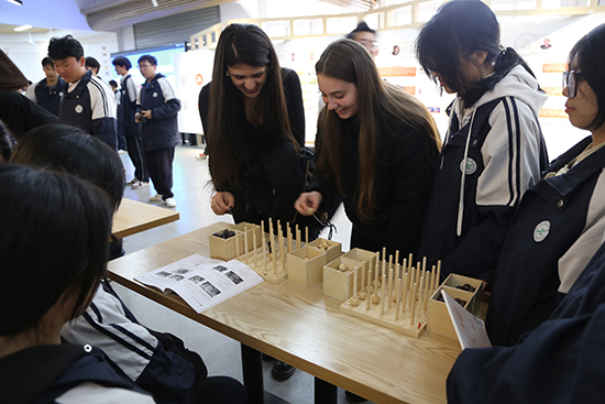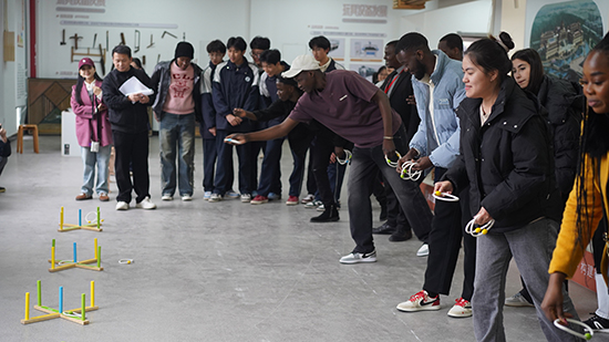 參觀結(jié)束后,木玩游戲挑戰(zhàn)點(diǎn)燃全場熱情。在學(xué)校專業(yè)教師、學(xué)生助理裁判的組織下,技巧球、投壺、魯班鎖、漢諾塔等兼具技巧與腦力的項(xiàng)目有序開展。中外師生分組競技、默契配合,在賽前練習(xí)與正式比拼中切磋交流,賽場之上歡聲笑語不斷。木玩專業(yè)學(xué)生的專業(yè)引導(dǎo)、英語組教師的順暢溝通,讓這場跨文化互動(dòng)更顯順暢與暖心。