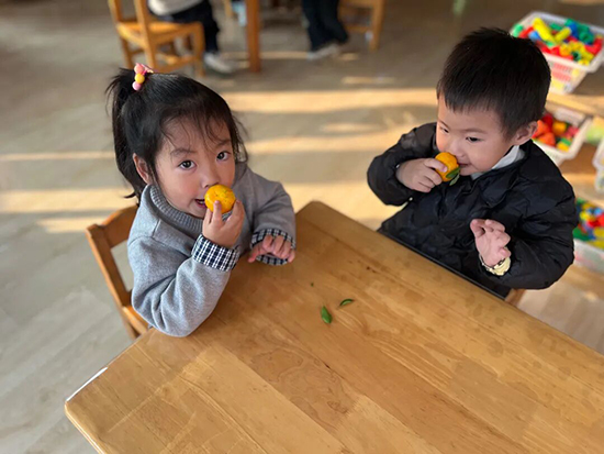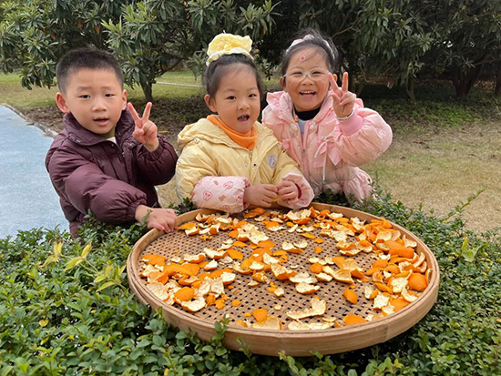 幼兒園的橘子林碩果累累,金黃的橘子掛滿枝頭。小班孩子們?cè)诶蠋煹膸ьI(lǐng)下,開(kāi)啟了歡樂(lè)的采摘之旅。他們穿梭在橘樹(shù)叢中,仔細(xì)挑選著成熟的果實(shí),小心翼翼地將一個(gè)個(gè)飽滿的橘子摘下,不一會(huì)兒就收獲了滿滿一籃。回到教室,孩子們圍繞橘子展開(kāi)探索:觀察其圓潤(rùn)的外形、鮮亮的色澤,觸摸果皮粗糙的質(zhì)感;輕輕剝開(kāi)橘子,聆聽(tīng)果皮裂開(kāi)的“咔嚓”聲,欣賞橘瓣緊密相擁的模樣。品嘗環(huán)節(jié)中,孩子們分享著酸酸甜甜的果肉,交流著味蕾的感受。隨后,大家將橘子皮平鋪在竹匾里,搬到陽(yáng)光充足的戶外晾曬。這場(chǎng)與橘子的親密互動(dòng),不僅讓孩子們體會(huì)到勞動(dòng)的成就感,學(xué)會(huì)珍惜自然資源,更在冬日暖陽(yáng)中收獲了探索自然的快樂(lè)。